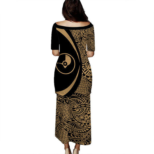 Yap State Off Shoulder Long Dress Plumeria Flowers Tribal Motif Yellow Version