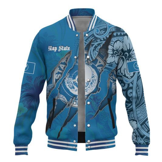 Yap State Baseball Jacket Custom Yapese Blood Inside Me Polynesian Sleeve Tattoo Tropical Blue
