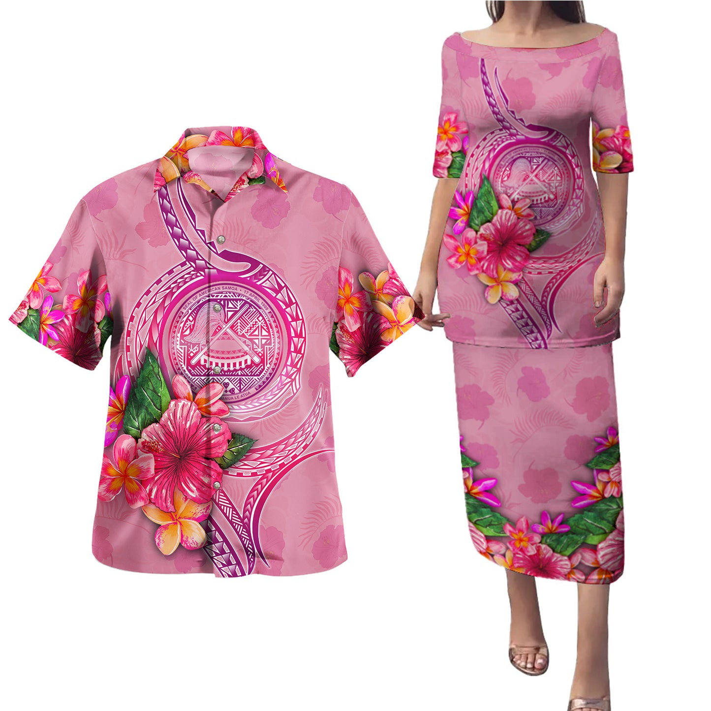 American Samoa Combo Puletasi And Shirt Floral With Seal Pink