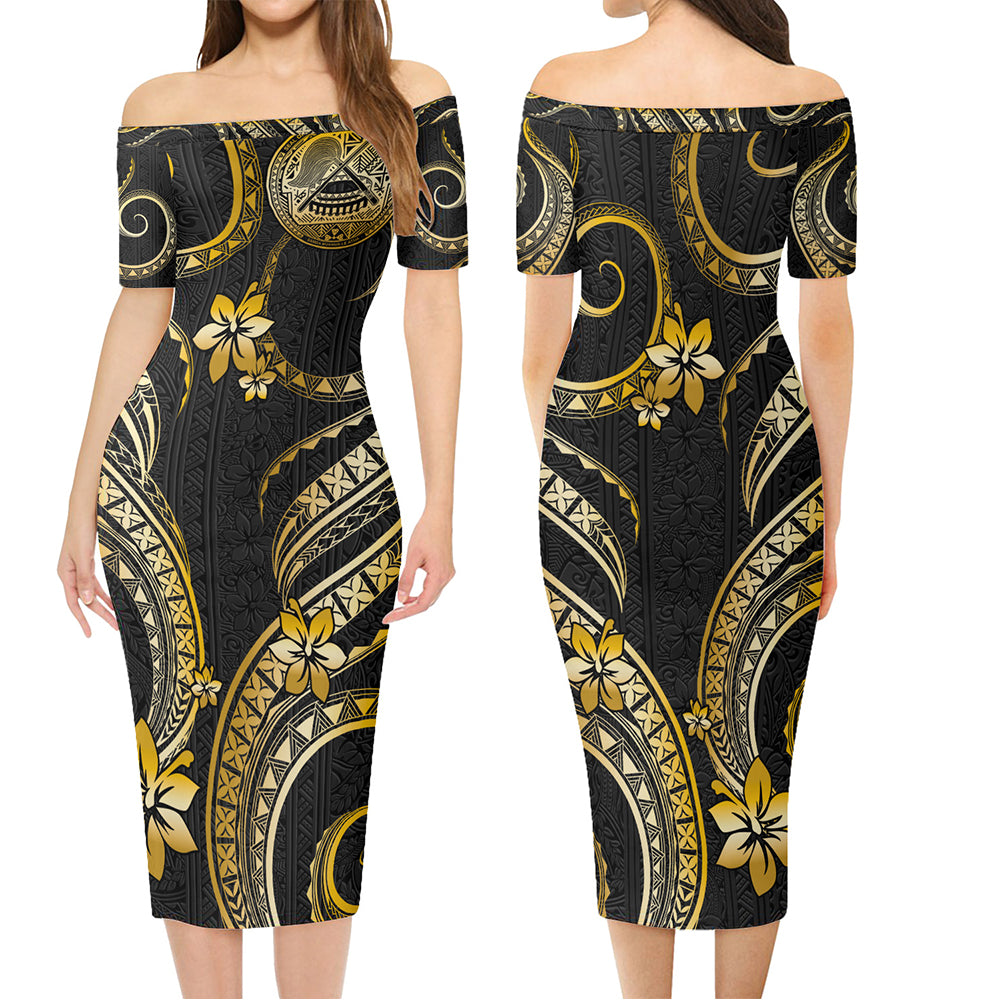 American Samoa Combo Short Sleeve Dress And Shirt Golden Polynesian Pattern
