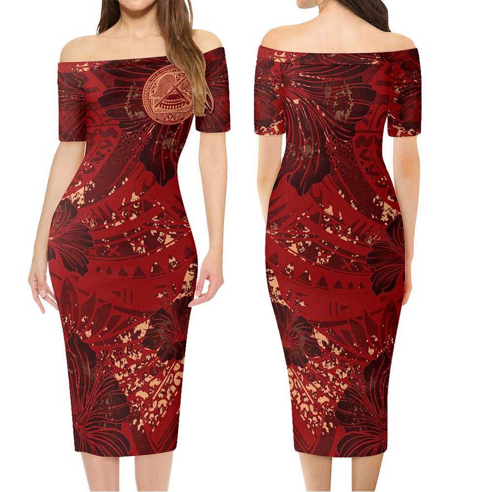 American Samoa Combo Short Sleeve Dress And Shirt Hibiscus With Polynesian Pattern Red Version