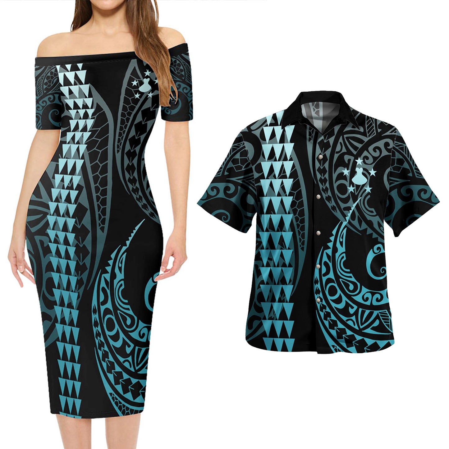Austral Islands Combo Short Sleeve Dress And Shirt Kakau Style Turquoise