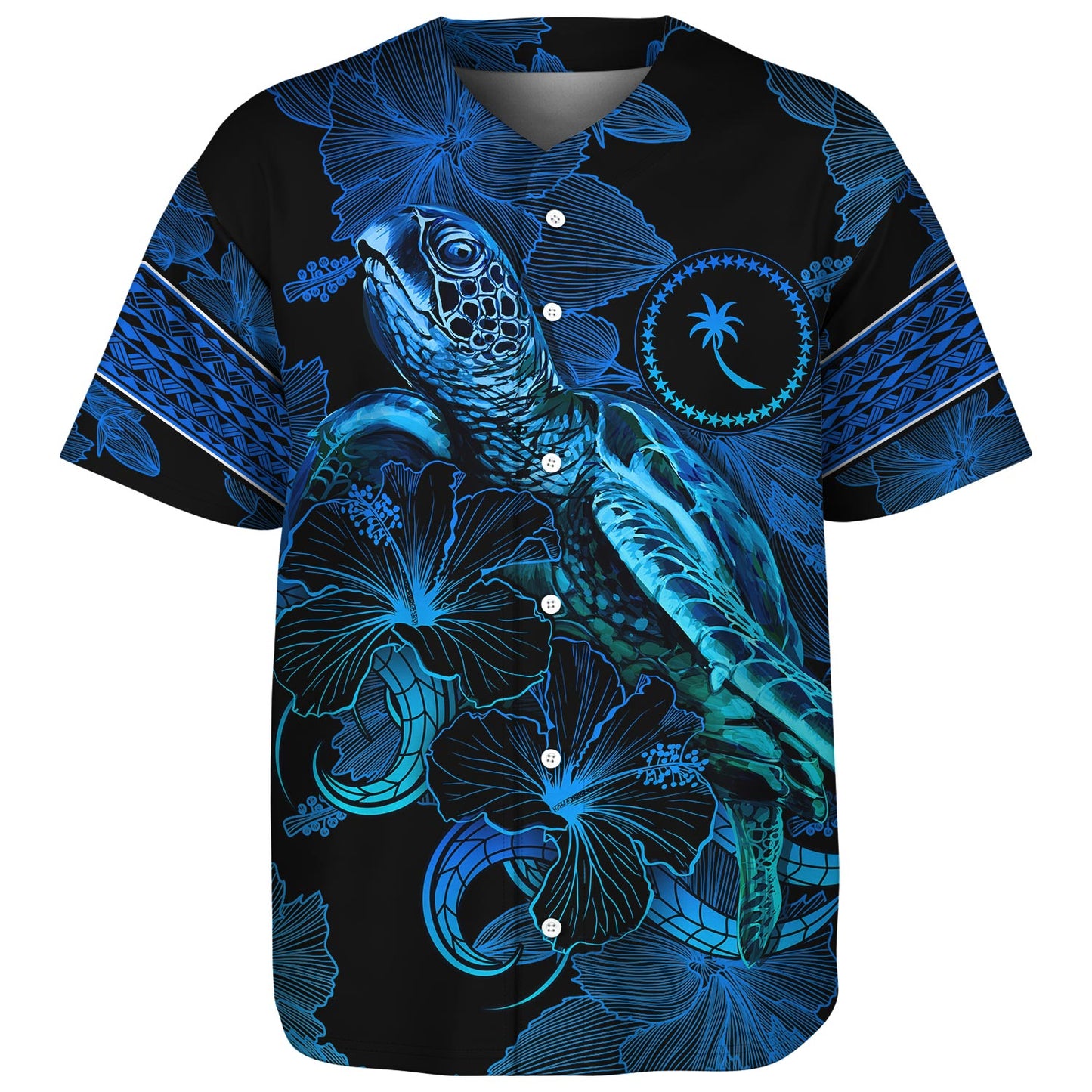 Chuuk State Baseball Shirt Sea Turtle With Blooming Hibiscus Flowers Tribal Blue
