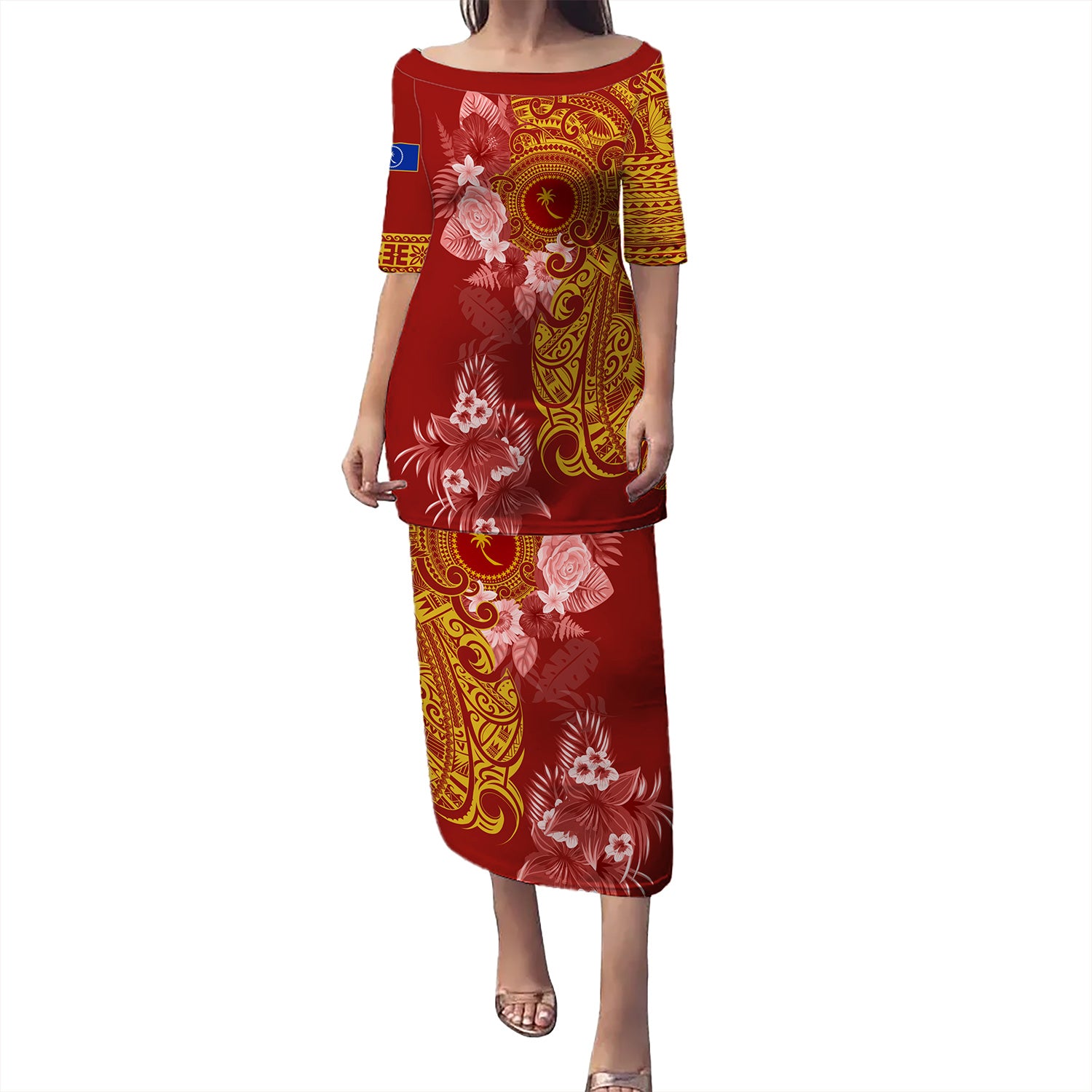 Chuuk State Combo Puletasi And Shirt Polynesian Tropical Plumeria Tribal Red