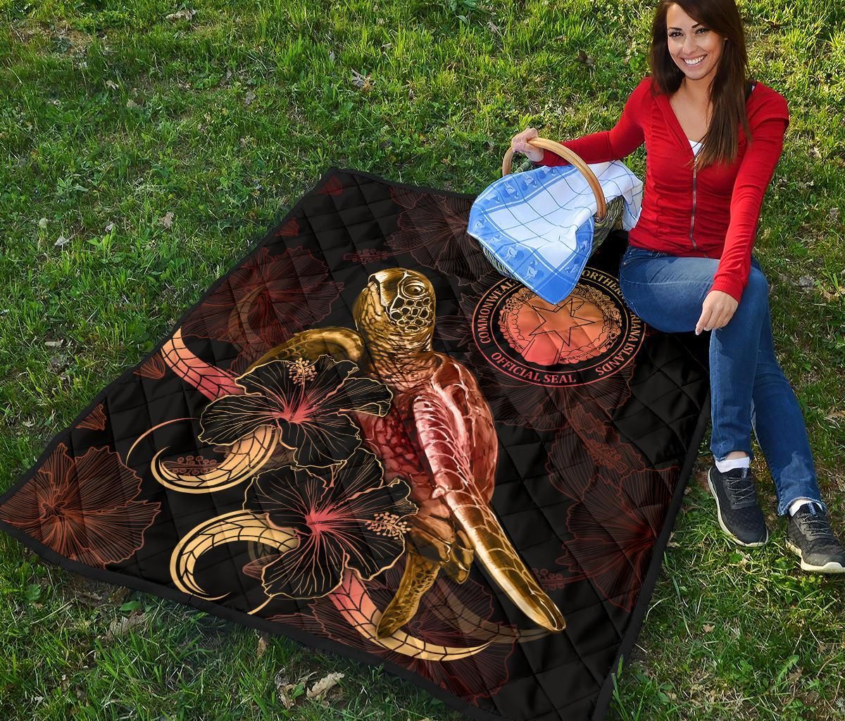 CNMI Polynesian Premium Quilt - Turtle With Blooming Hibiscus Gold