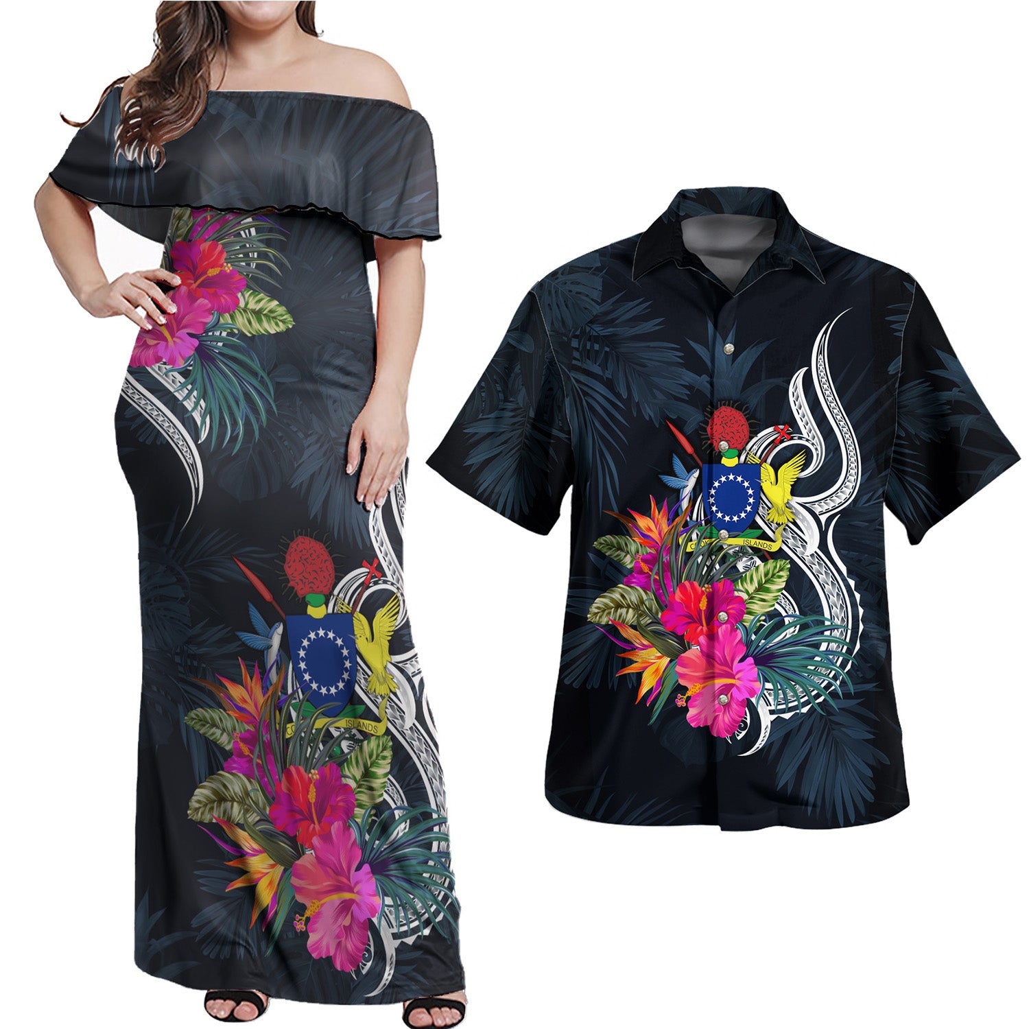 Cook Islands Combo Off Shoulder Long Dress And Shirt Tropical Flower