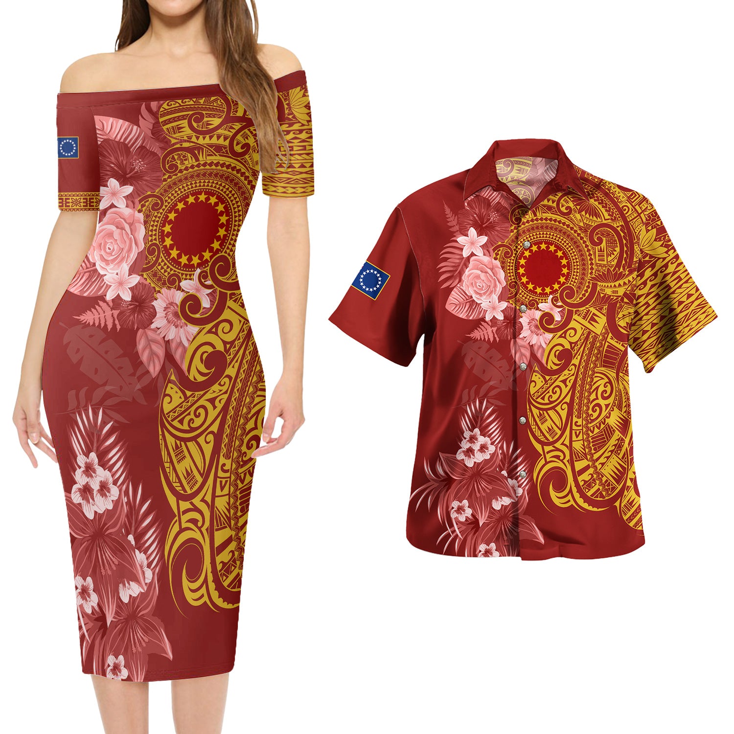 Cook Islands Combo Short Sleeve Dress And Shirt Polynesian Tropical Plumeria Tribal Red