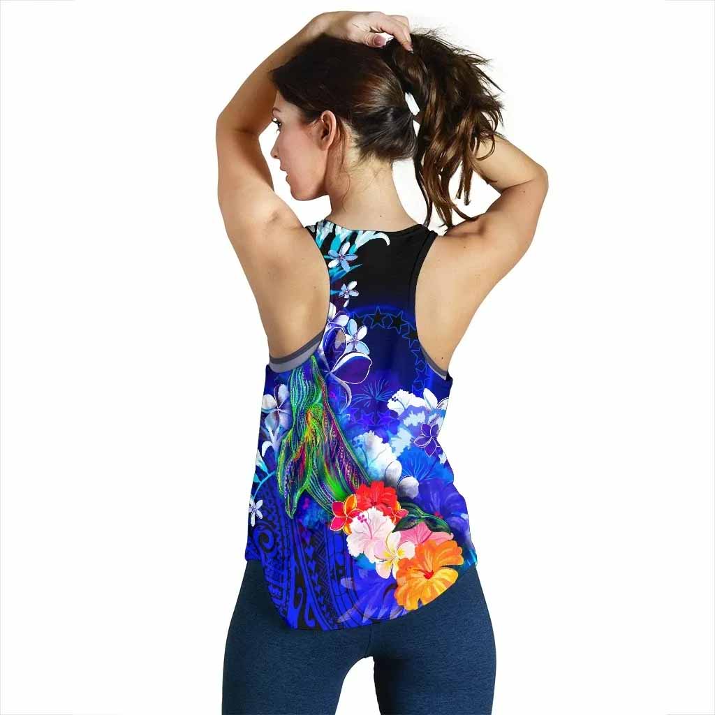 Cook Islands Custom Personalised Women Racerback Tank - Humpback Whale with Tropical Flowers (Blue)