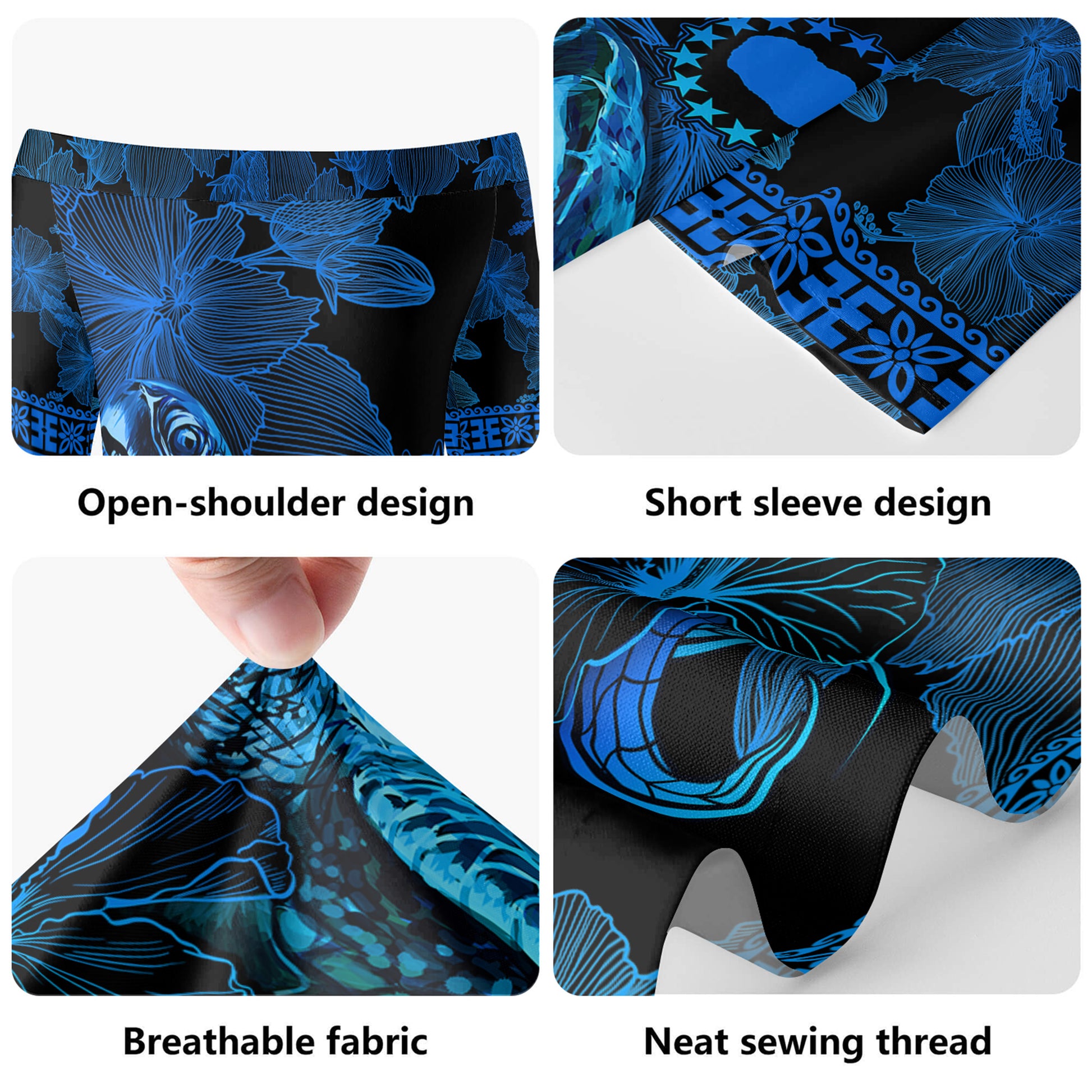 Cook Islands Short Sleeve Off The Shoulder Lady Dress Sea Turtle With Blooming Hibiscus Flowers Tribal Blue