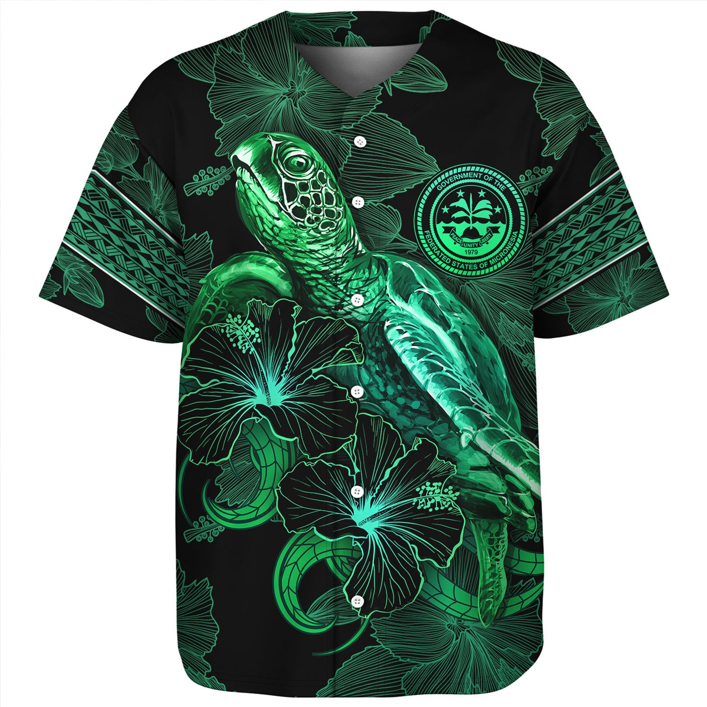 Federated States Of Micronesia Baseball Shirt Sea Turtle With Blooming Hibiscus Flowers Tribal Green