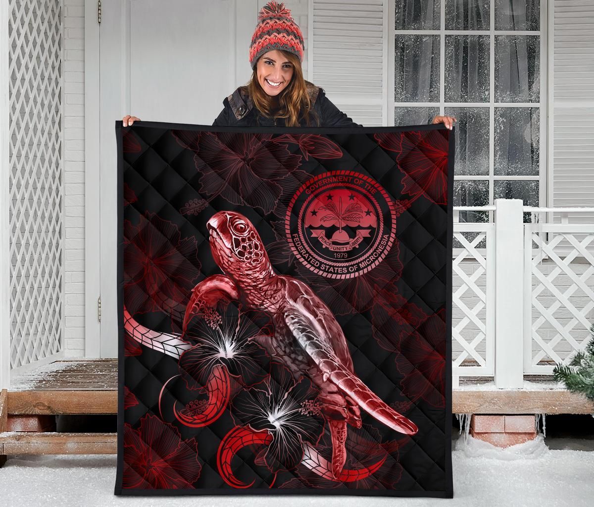 Federated States of Micronesia Polynesian Premium Quilt - Turtle With Blooming Hibiscus Red