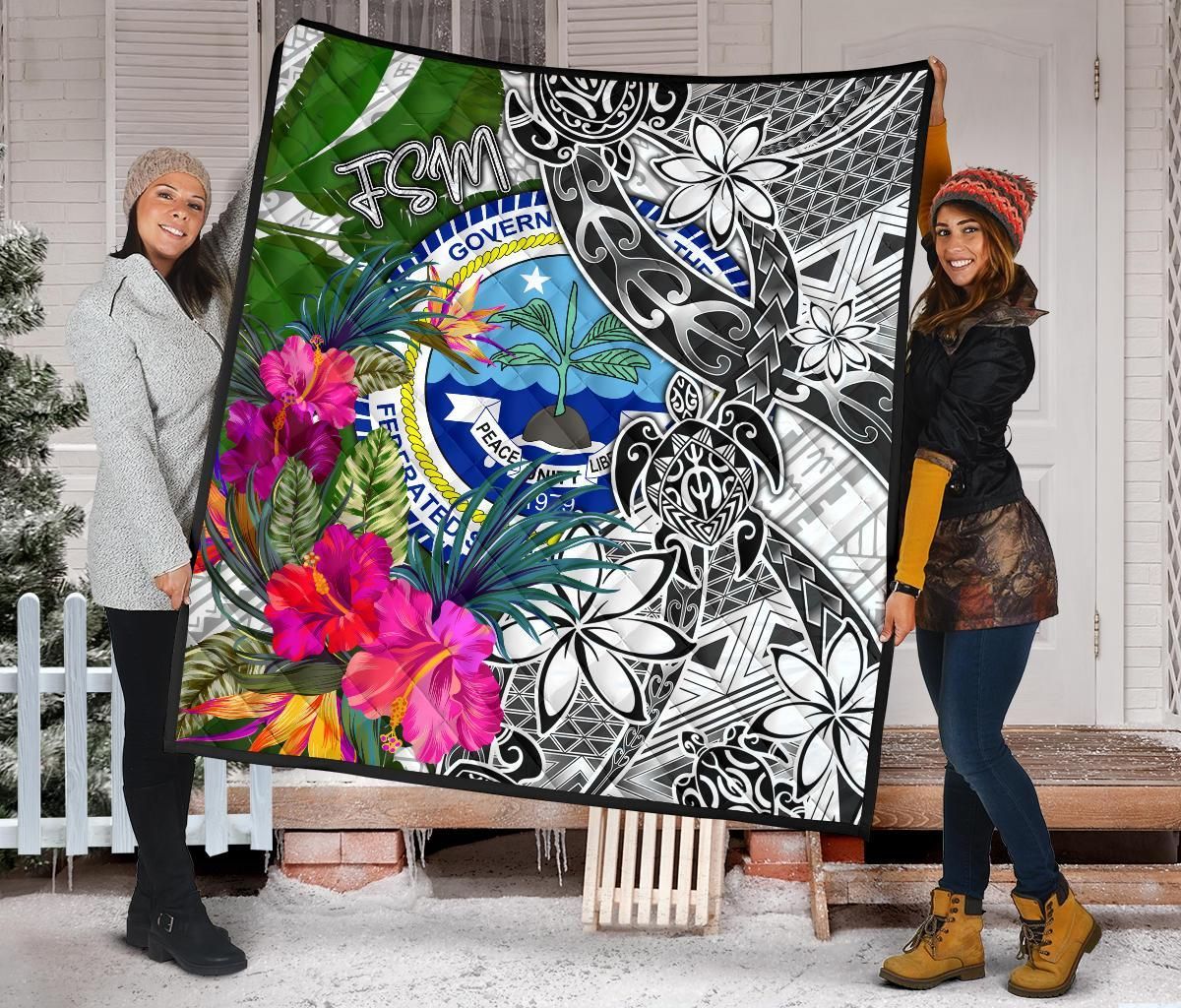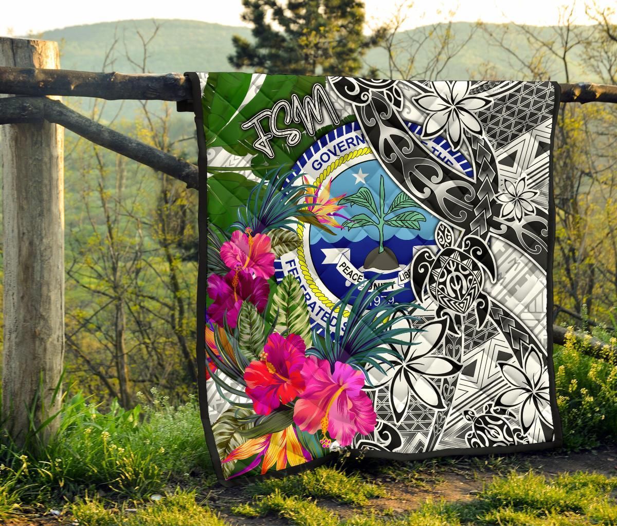 Federated States of Micronesia Premium Quilt White - Turtle Plumeria Banana Leaf