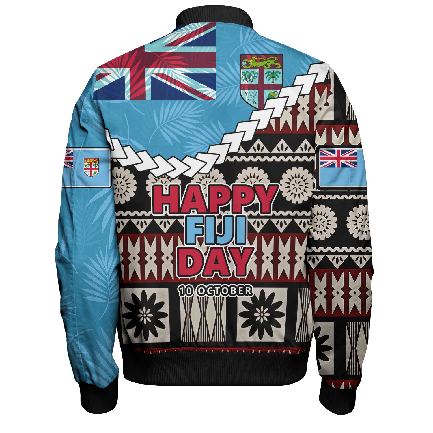 Fiji Bomber Jacket Happy Fiji Day Fijian Masi x Tropical Palm Leaf Tribal Curve Style