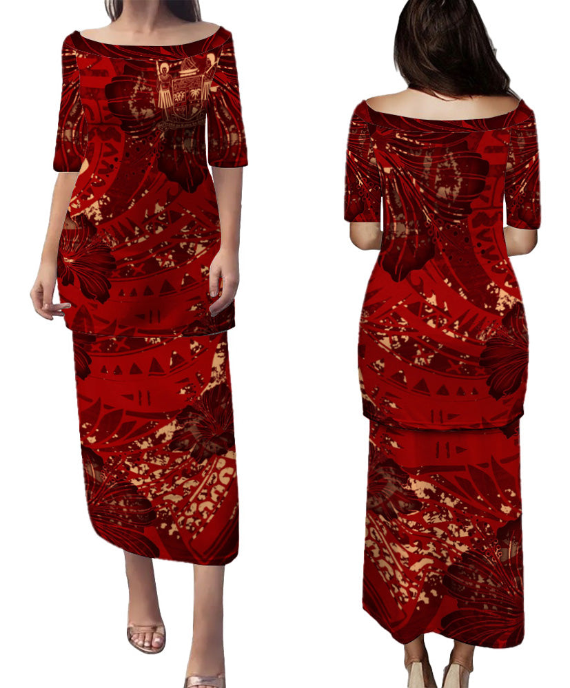 Fiji Combo Puletasi And Shirt Hibiscus With Polynesian Pattern Red Version