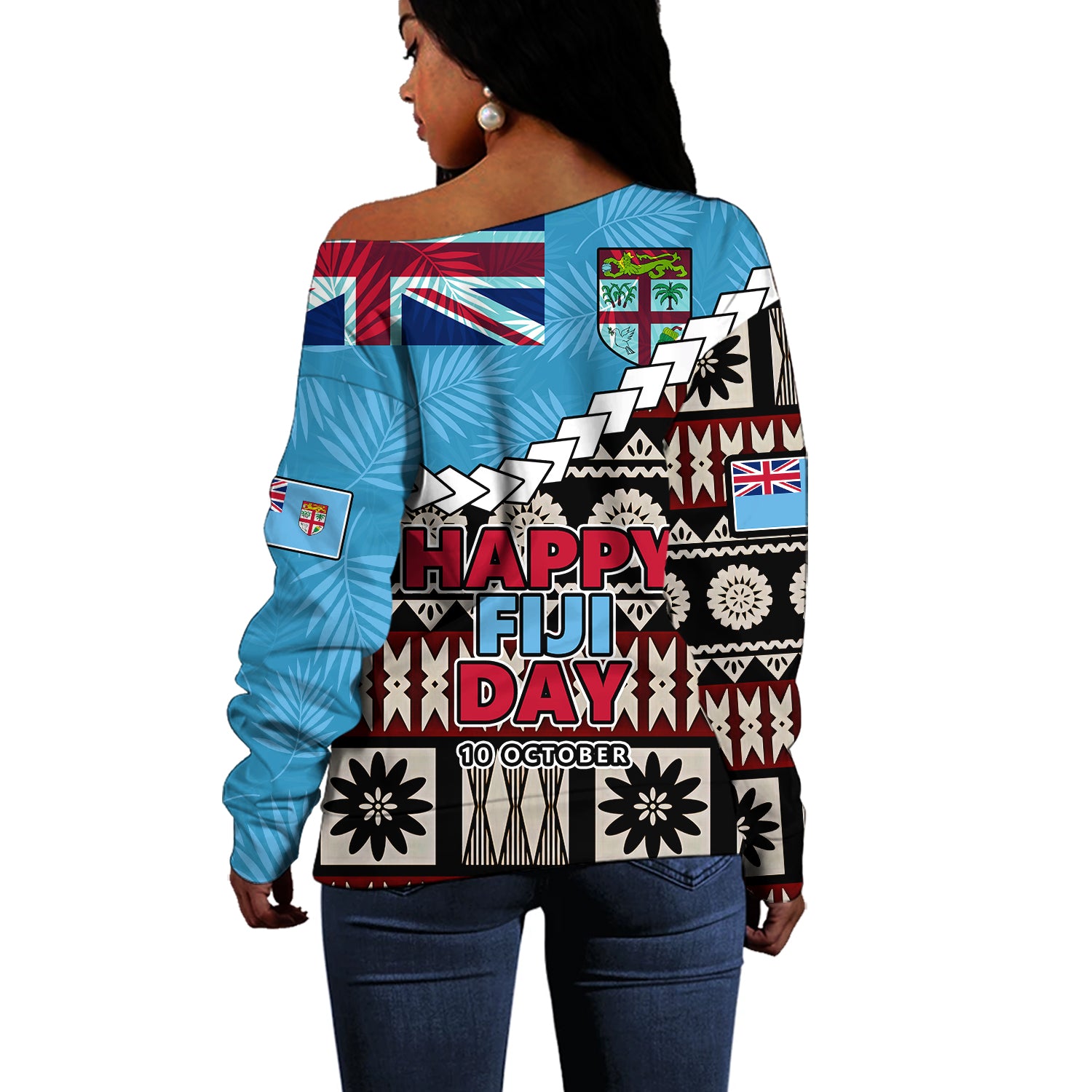 Fiji Off Shoulder Sweatshirt Happy Fiji Day Fijian Masi x Tropical Palm Leaf Tribal Curve Style