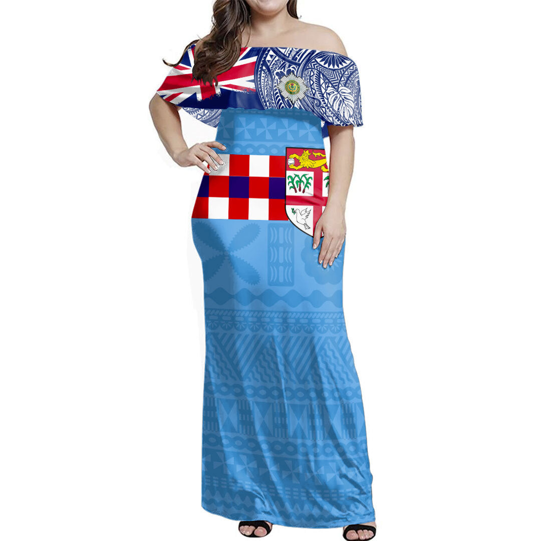 Fiji Woman Off Shoulder Long Dress Fijian UK Flag With Coat Of Arms