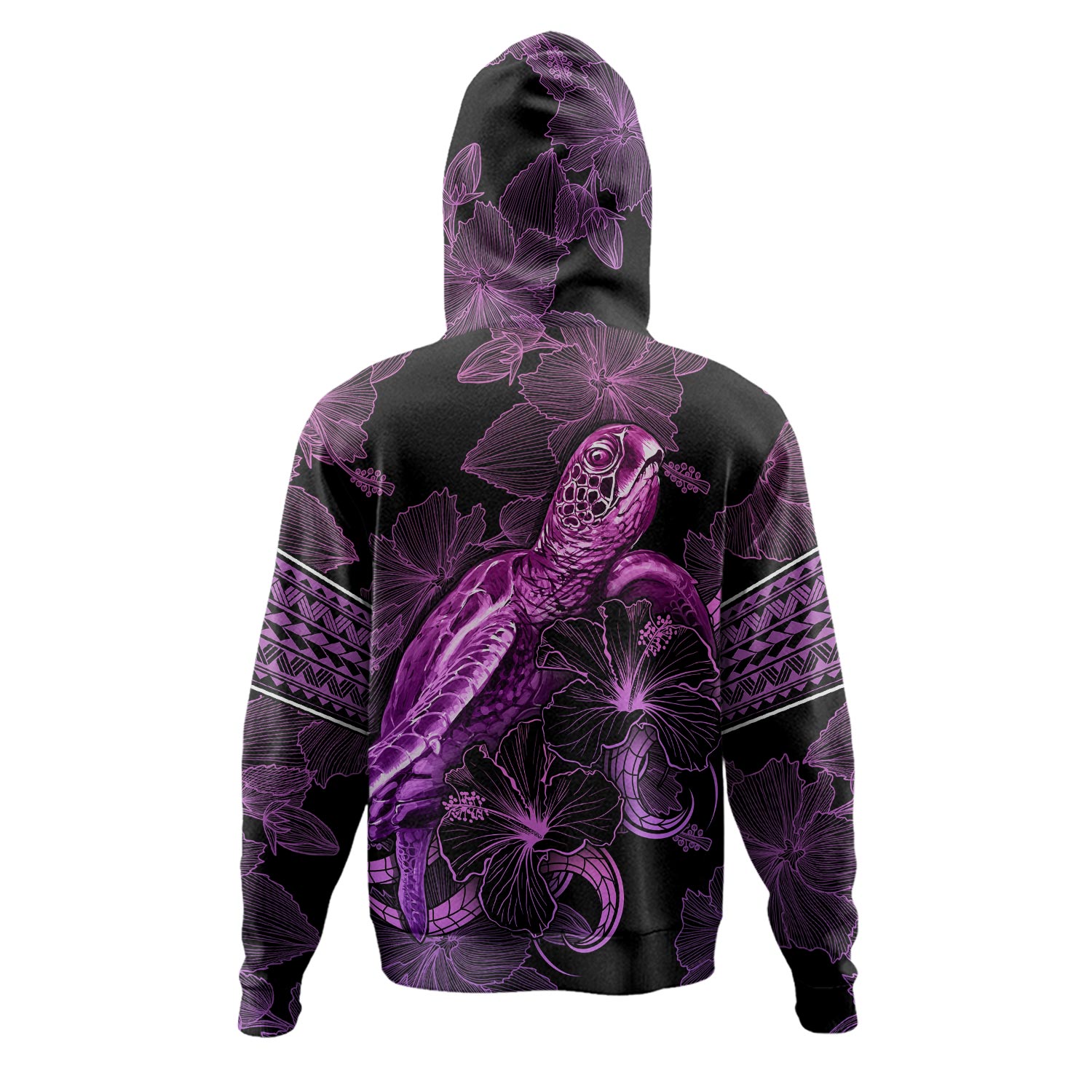 French Polynesia Hoodie Sea Turtle With Blooming Hibiscus Flowers Tribal Purple