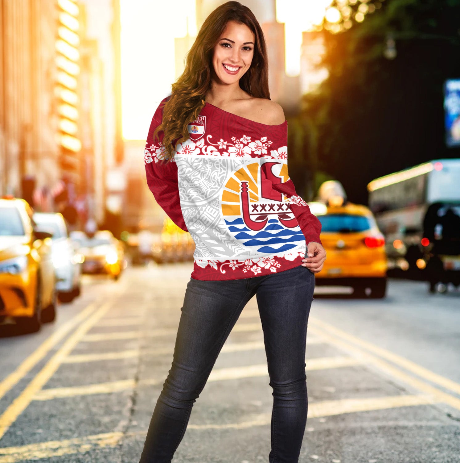 French Polynesia Off Shoulder Sweatshirt Seal With Plumeria Flowers Polynesia Patterns