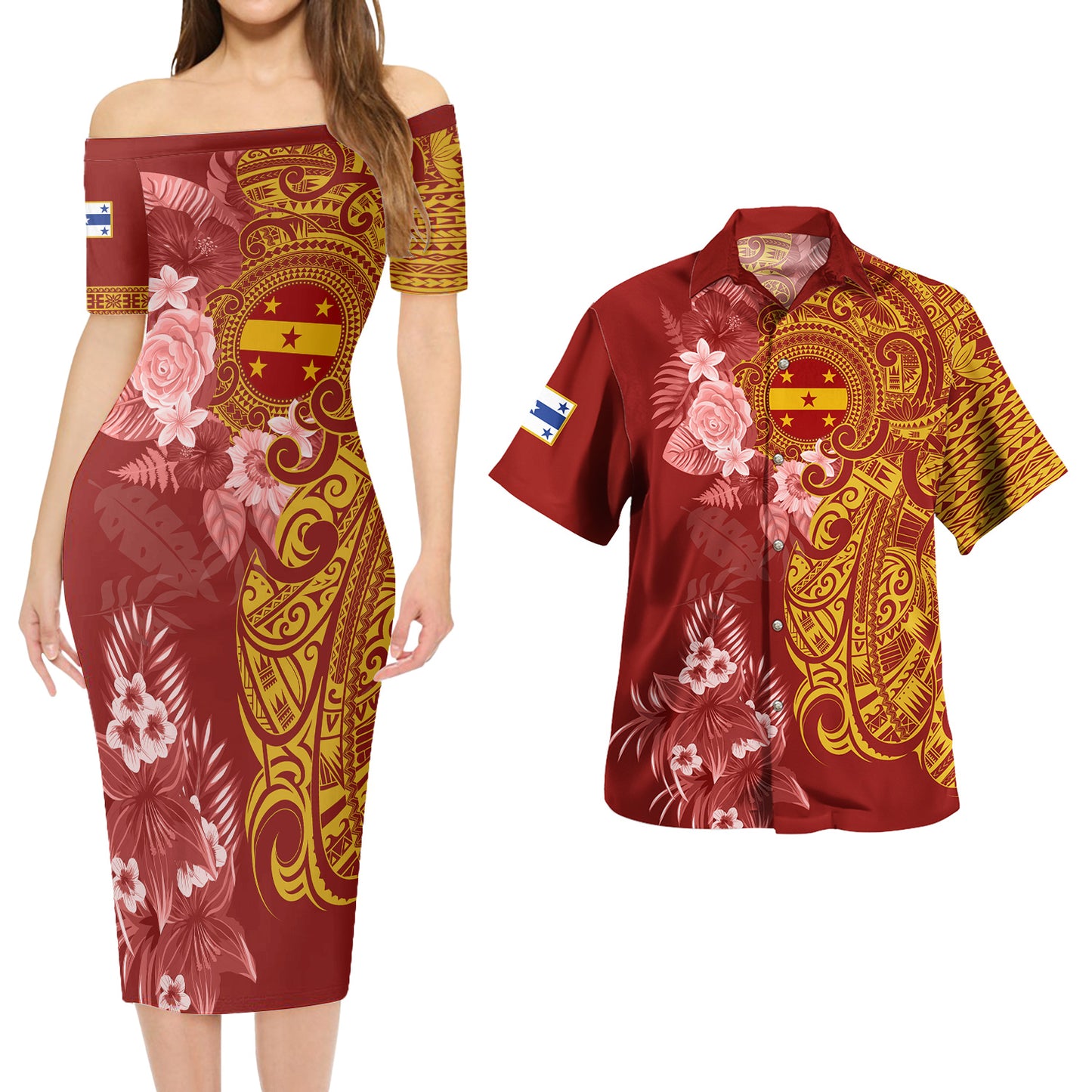 Gambier Islands Combo Short Sleeve Dress And Shirt Polynesian Tropical Plumeria Tribal Red
