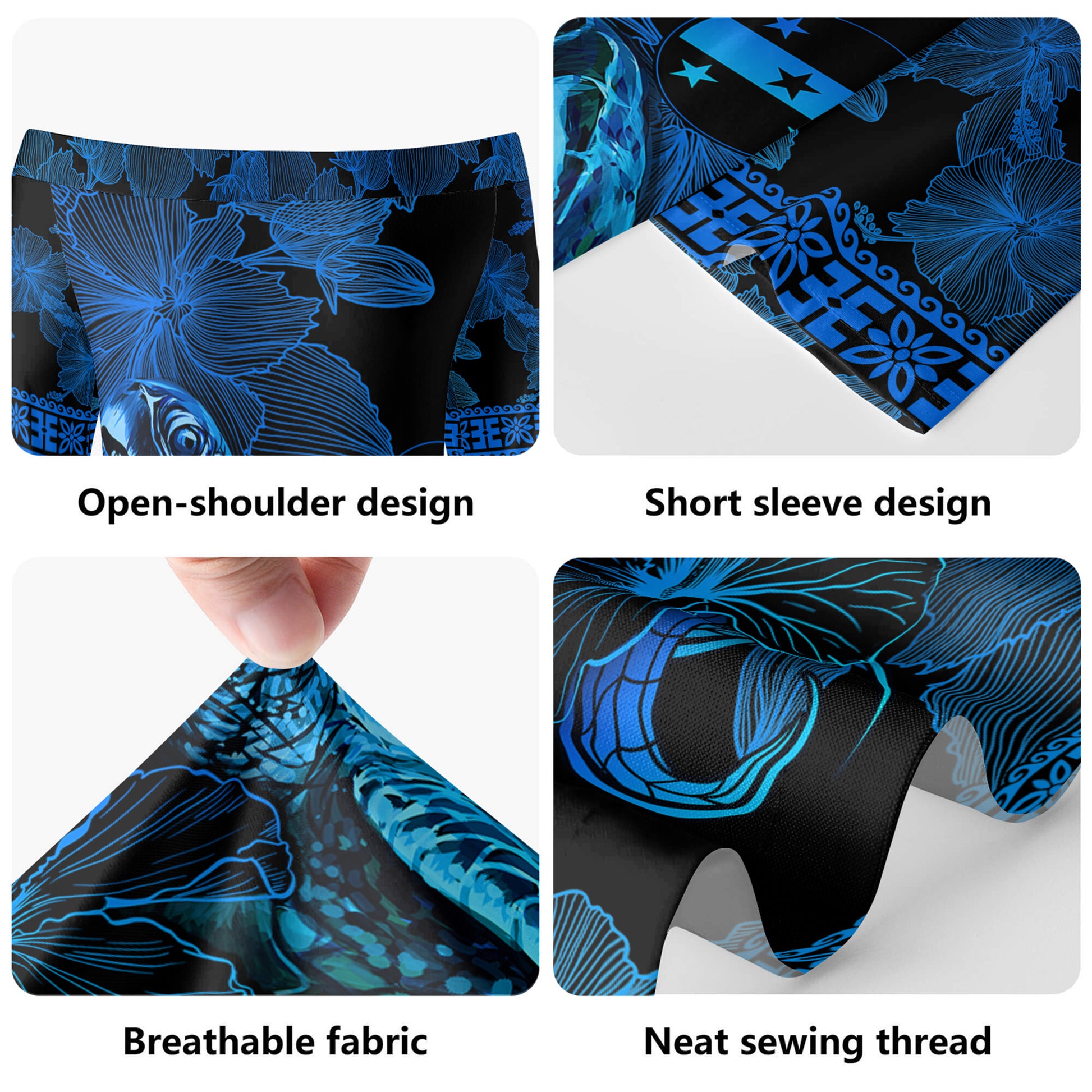 Gambier Islands Short Sleeve Off The Shoulder Lady Dress Sea Turtle With Blooming Hibiscus Flowers Tribal Blue