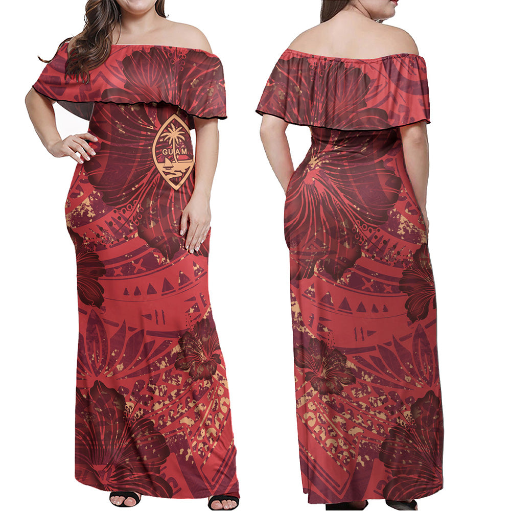 Guam Combo Off Shoulder Long Dress And Shirt Hibiscus With Polynesian Pattern Red Version