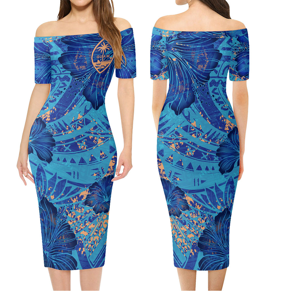 Guam Combo Short Sleeve Dress And Shirt Hibiscus With Polynesian Pattern Blue Version