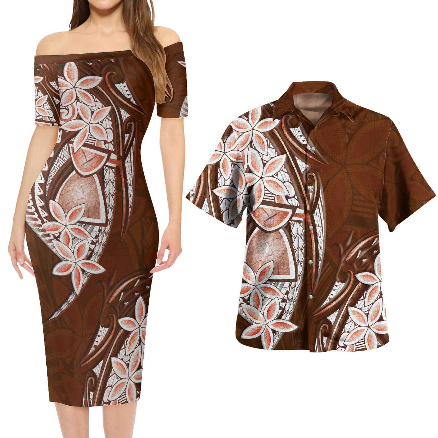 Guam Combo Short Sleeve Dress And Shirt Latte Stone Plumeria Flowers