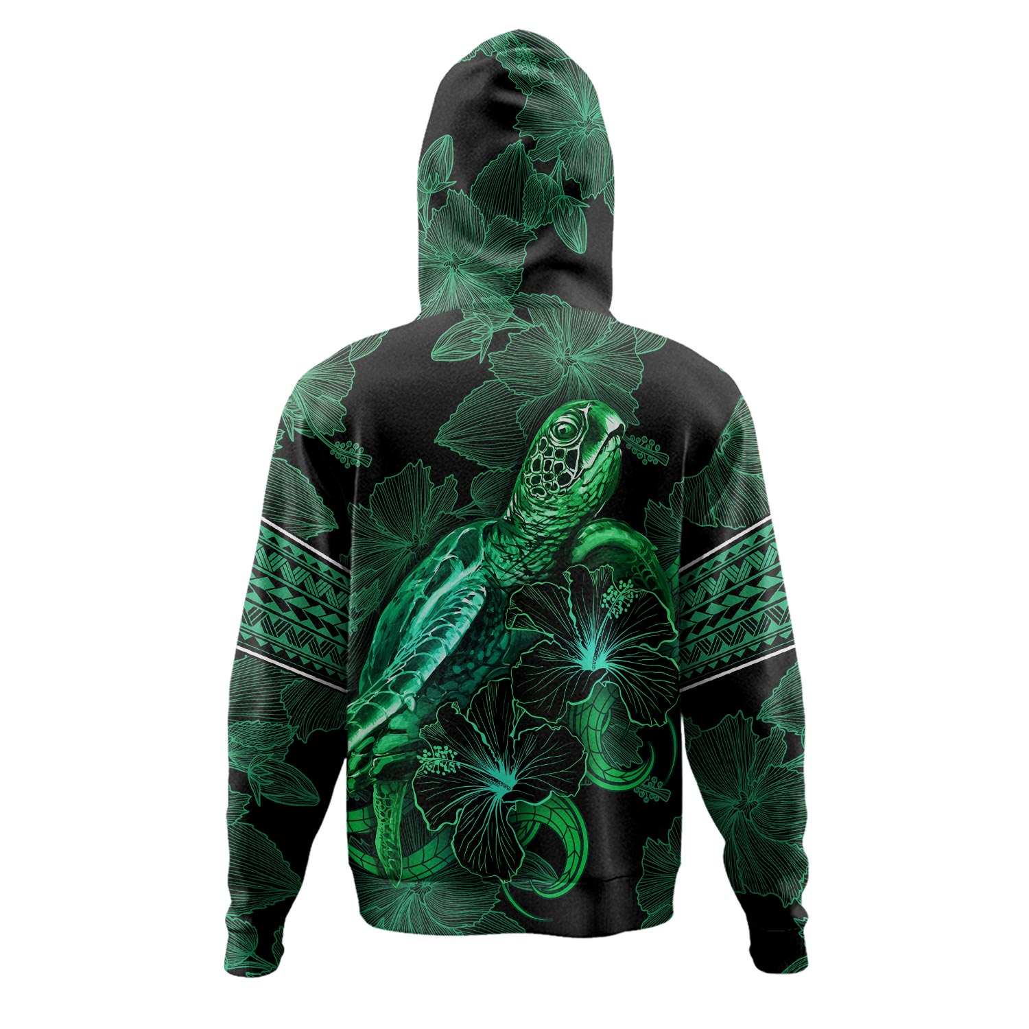 Guam Hoodie Sea Turtle With Blooming Hibiscus Flowers Tribal Green