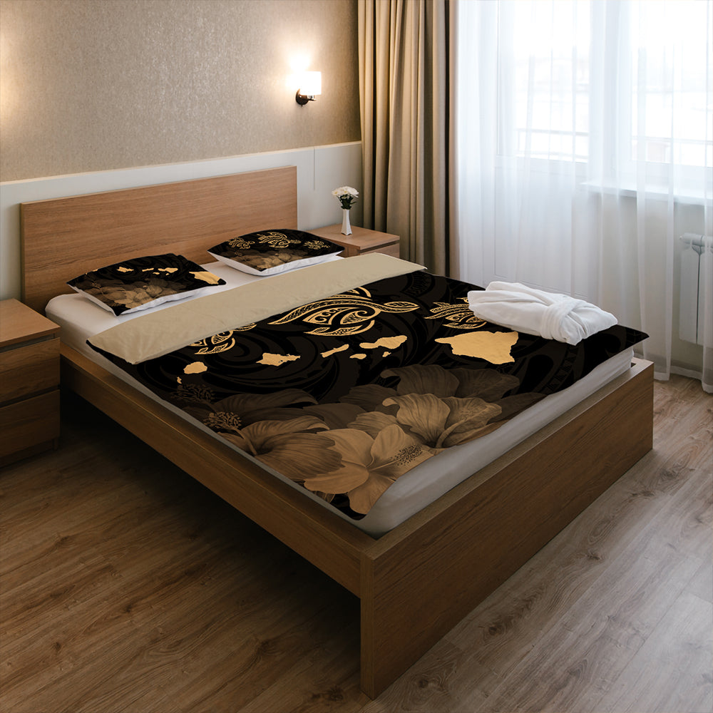 Hawaii Bedding Set Turtle Hibiscus Map Polynesian Family Gold
