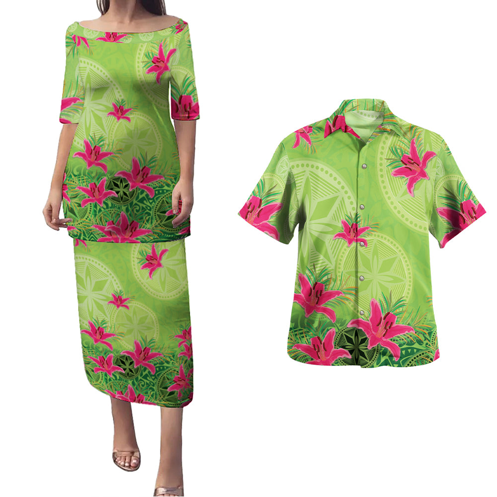 Hawaii Combo Puletasi And Shirt Lilies With Polynesian Pattern