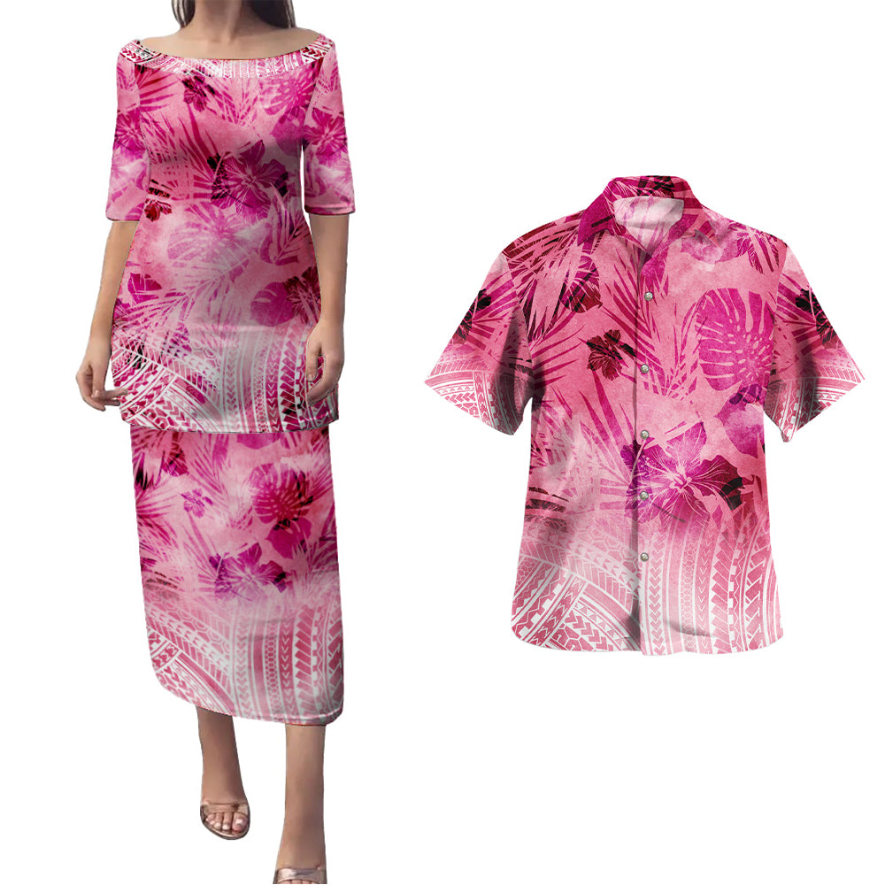 Hawaii Combo Puletasi And Shirt Pink Hibiscus White Polynesian Pattern