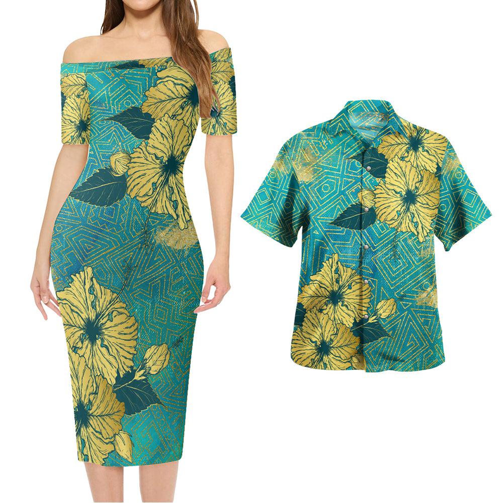 Hawaii Combo Short Sleeve Dress And Shirt Golden Hibiscus Turquoise Color