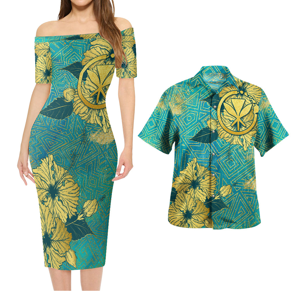 Hawaii Combo Short Sleeve Dress And Shirt Golden Hibiscus Turquoise Color Tribal Pattern
