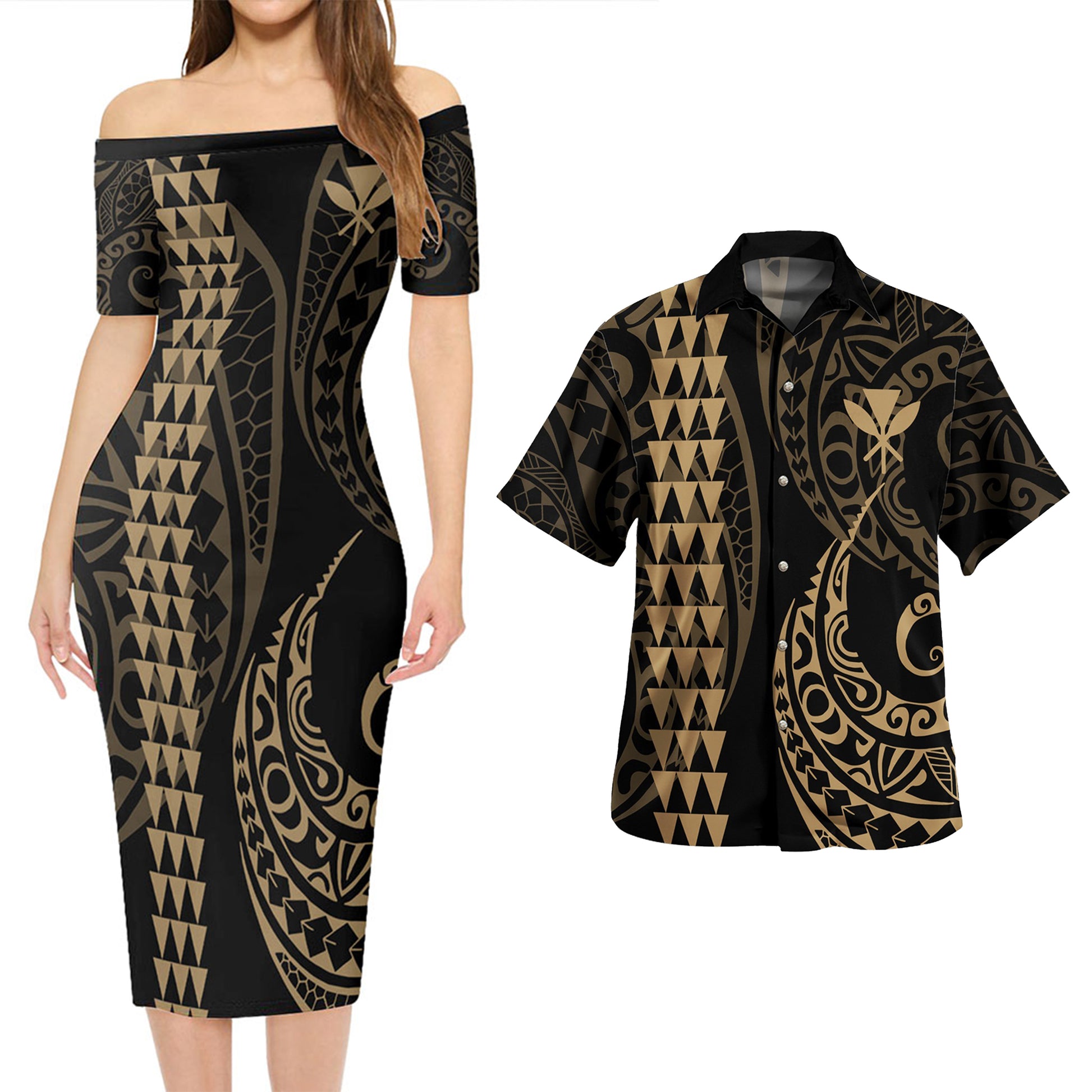 Hawaii Combo Short Sleeve Dress And Shirt Kanaka Kakau Style Gold