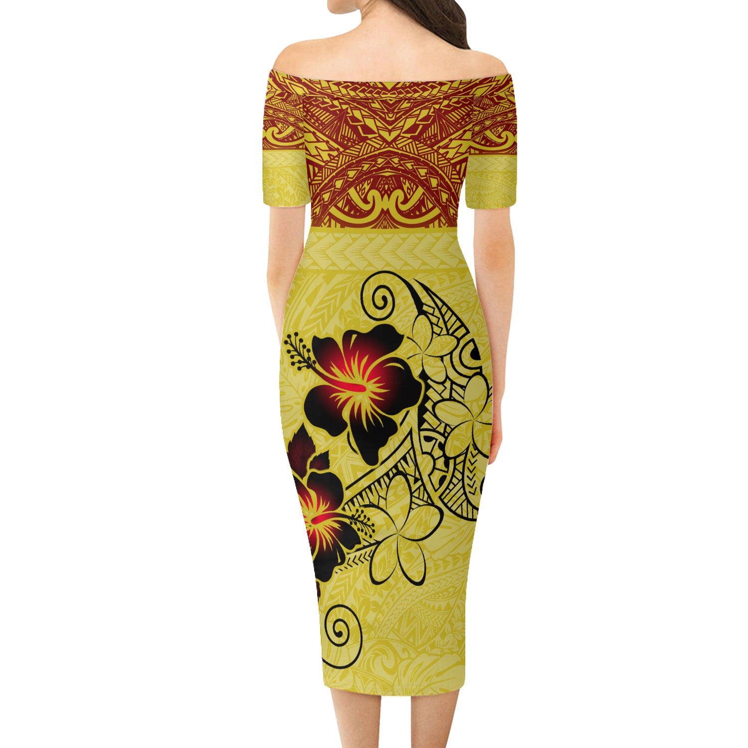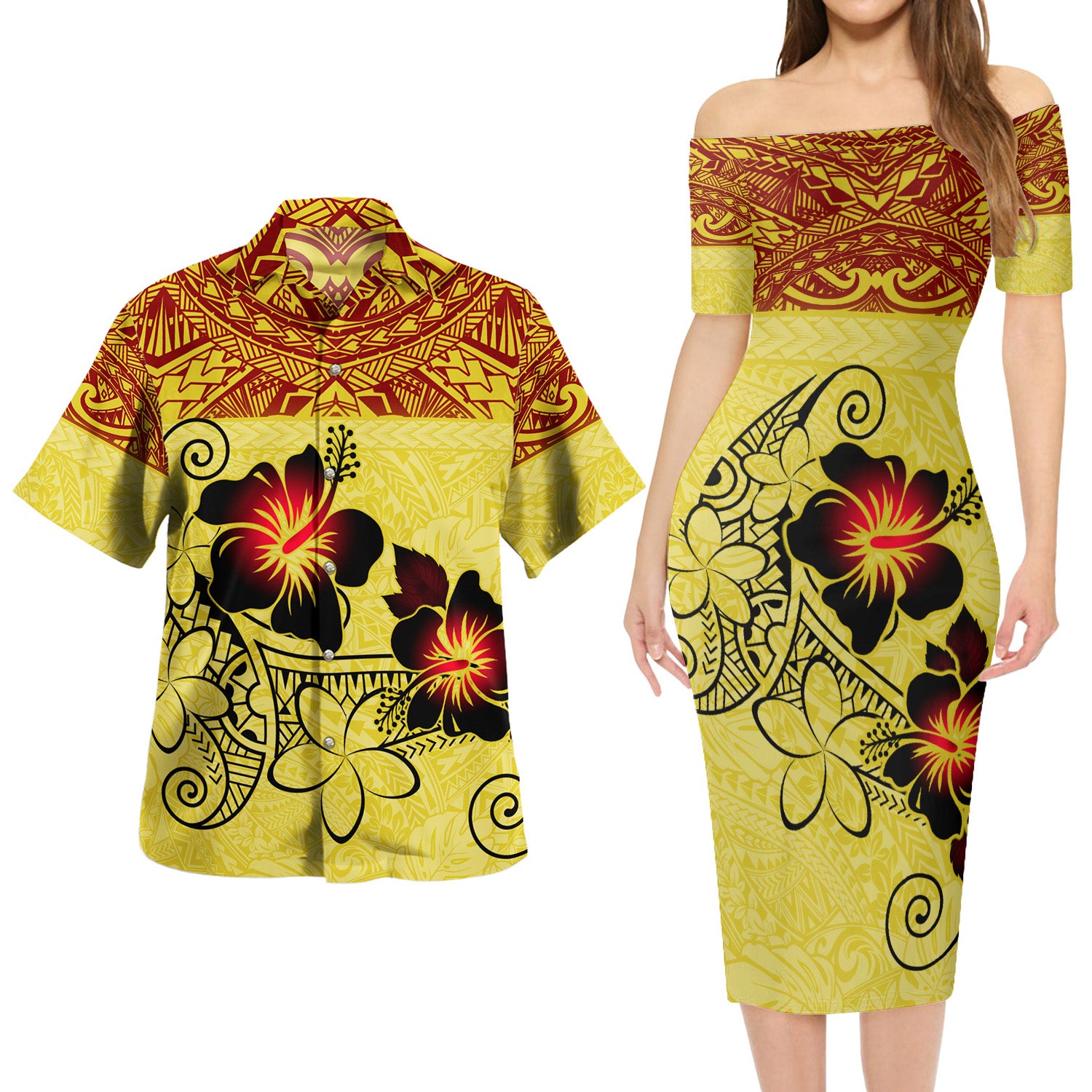 Hawaii Combo Short Sleeve Dress And Shirt Polynesian Tribal Patterns Hibiscus Flowers Yellow Color