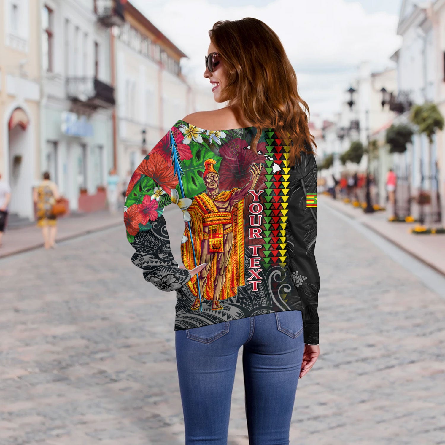 Hawaii Off Shoulder Sweatshirt King Kamehameha Hibiscus And Plumeria With Palm Branches Vintage Style