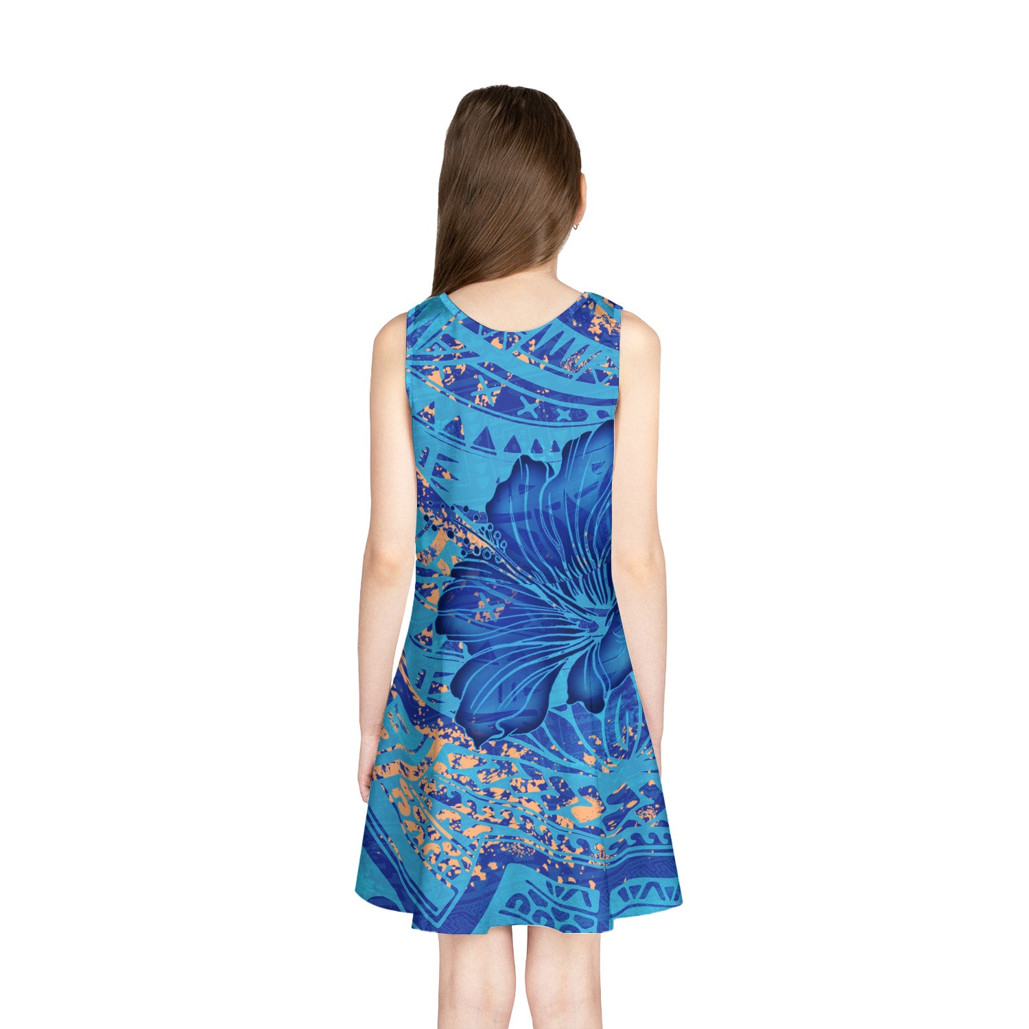 Hawaii Girls Sleeveless Sundress Blue Hibiscus With Polynesian Pattern