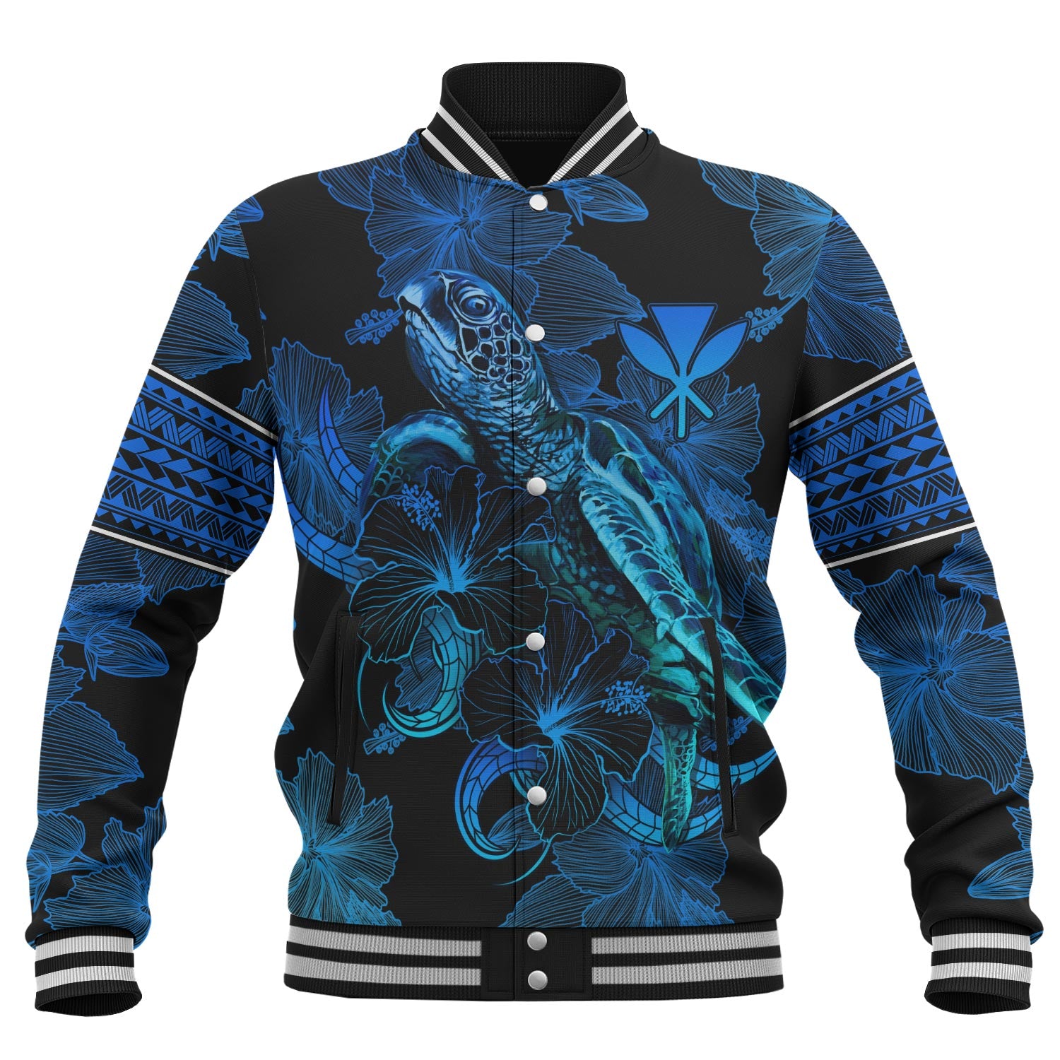 Hawaii Kanaka Maoli Baseball Jacket Sea Turtle With Blooming Hibiscus Flowers Tribal Blue