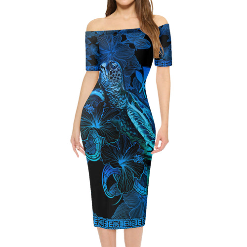 Hawaii Kanaka Maoli Short Sleeve Off The Shoulder Lady Dress Sea Turtle With Blooming Hibiscus Flowers Tribal Blue