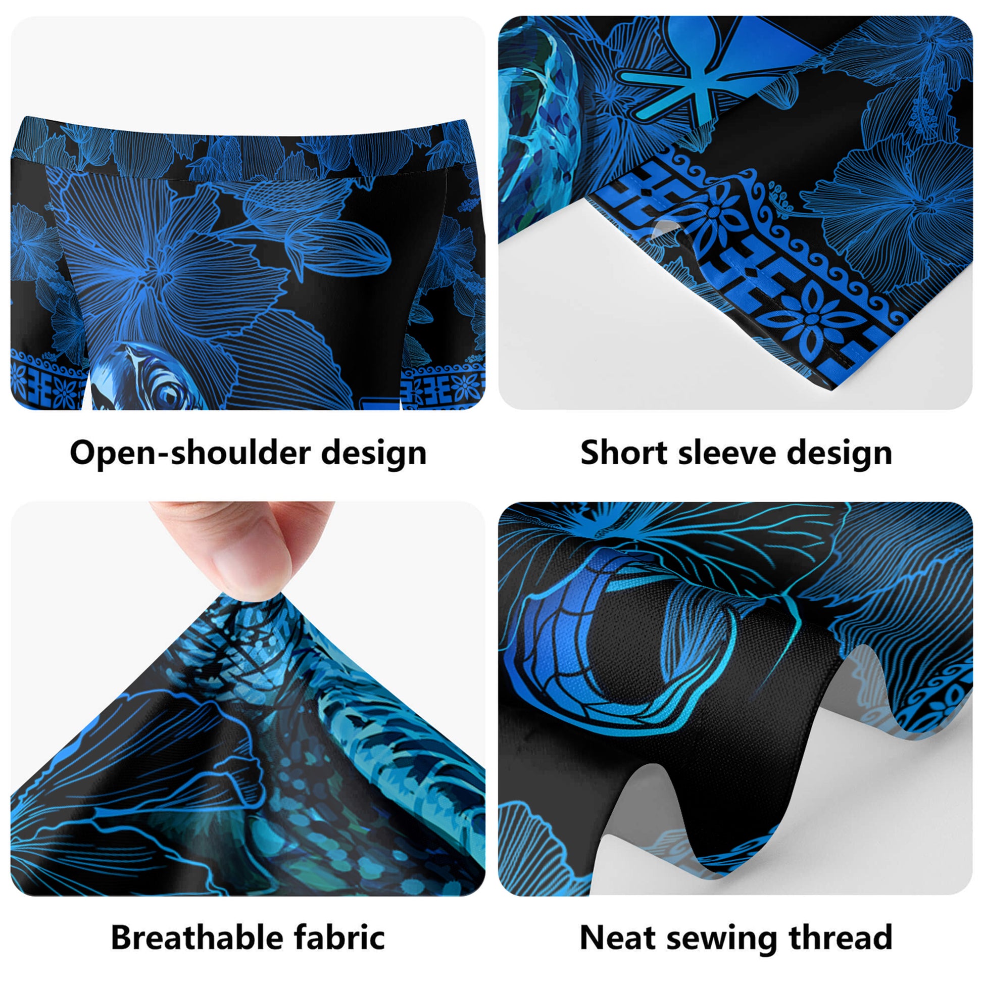 Hawaii Short Sleeve Off The Shoulder Lady Dress Sea Turtle With Blooming Hibiscus Flowers Tribal Blue