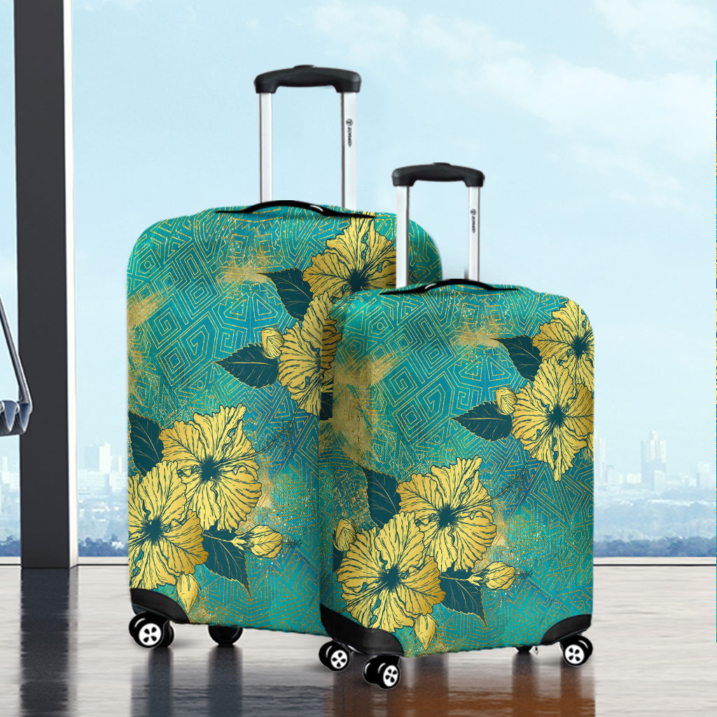 Hawaii Luggage Cover Golden Hibiscus Turquoise Color Tribal Pattern