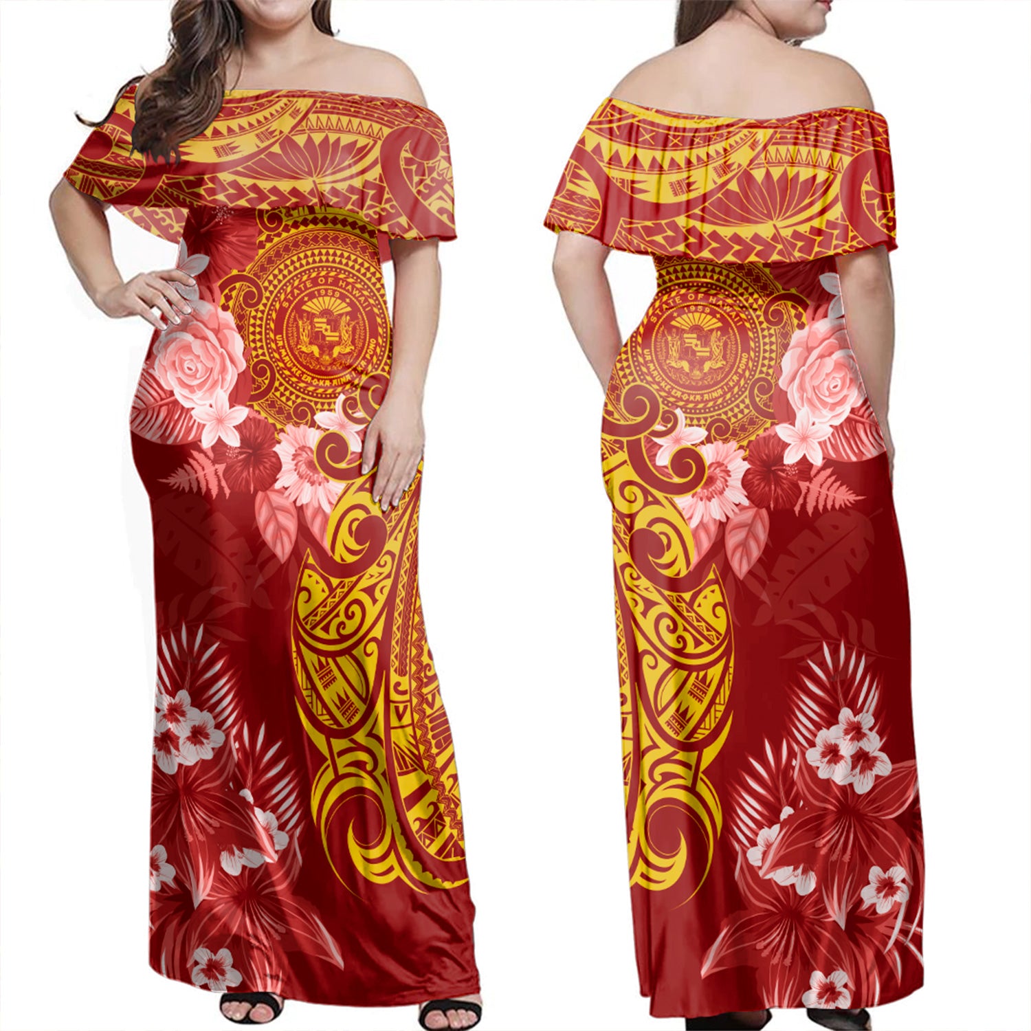 Hawaii Off Shoulder Long Dress Polynesian Tropical Plumeria Tribal Red