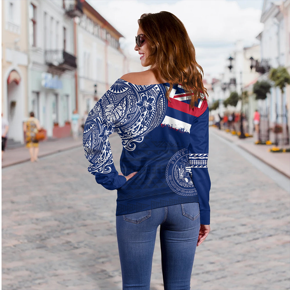 Hawaii Off Shoulder Sweatshirt Polynesian Flag With Coat Of Arms