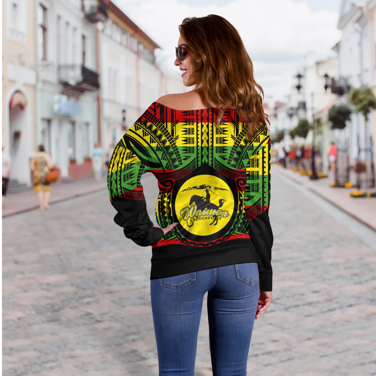 Hawaii Off Shoulder Sweatshirt Waimea Elementary School Reggae Color Polynesian