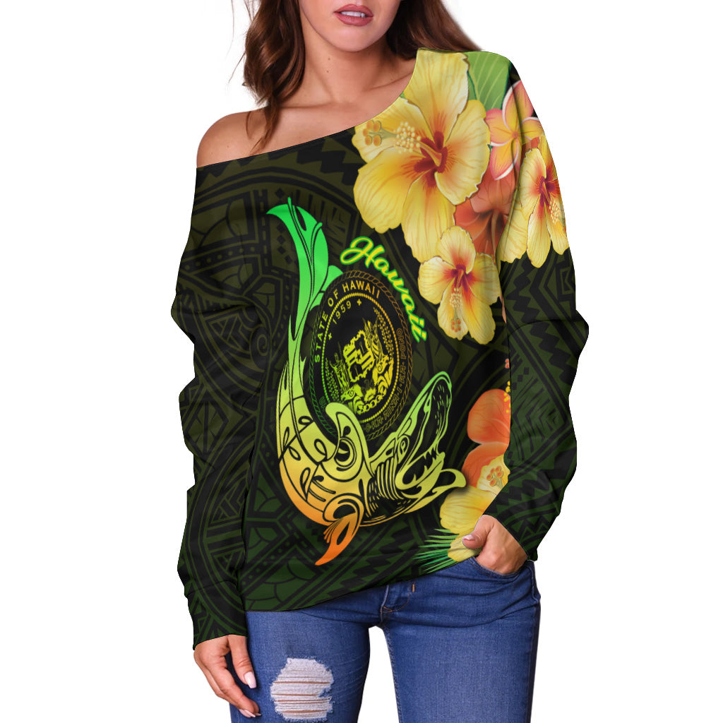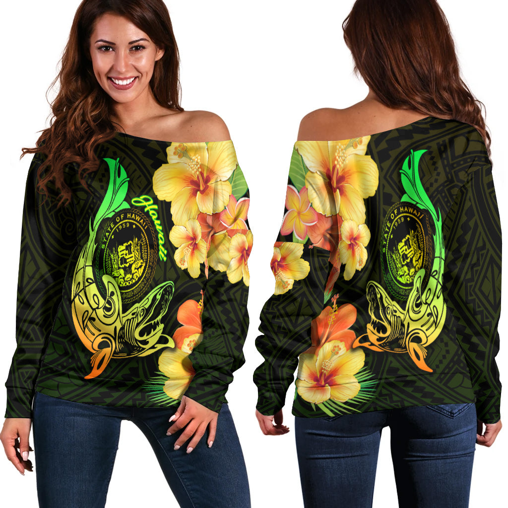 Hawaii Polynesian Women Off Shoulder Sweater - Hawaii Sharks Tribal Patterns Green