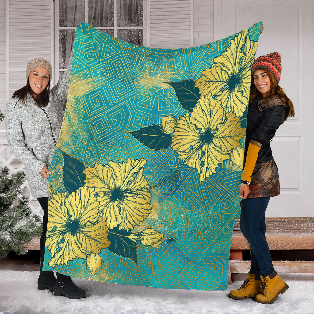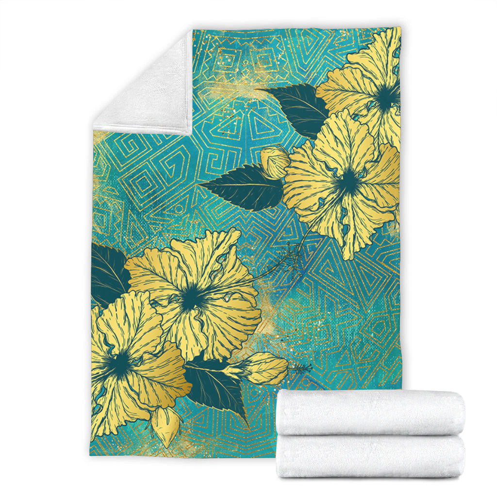 Hawaii Premium Blanket Golden Hibiscus Turquoise Color Tribal Pattern