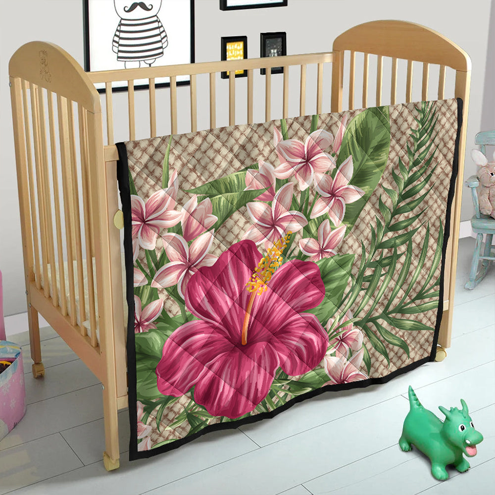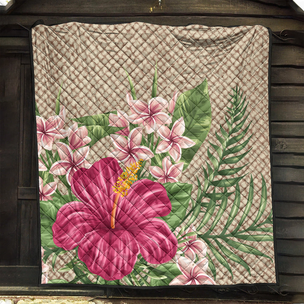 Hawaii Premium Quilt Hibiscus Plumeria Palm Leaves Lauhala Background Polynesian