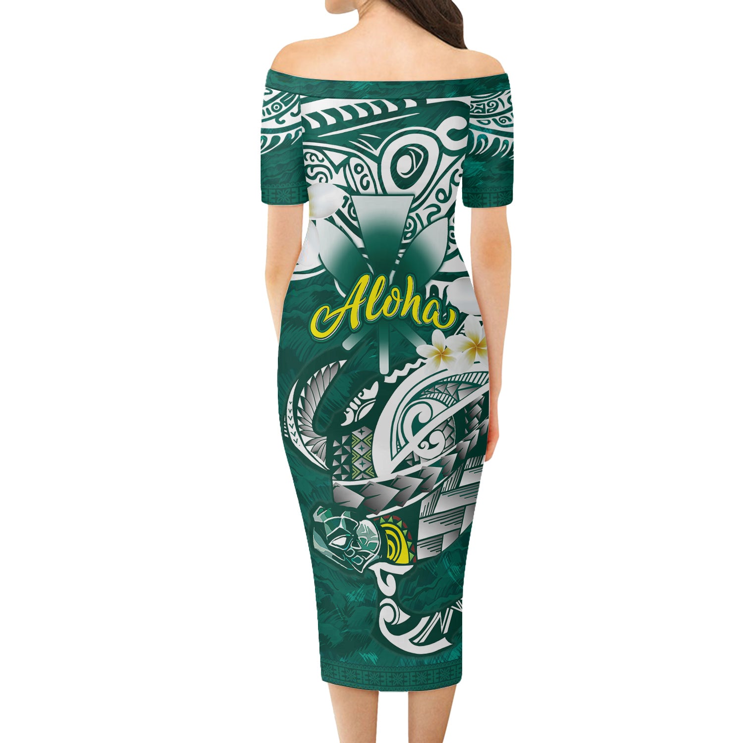 Hawaii Short Sleeve Off The Shoulder Lady Dress Polynesian Honu With Plumeria Tropical Ocean Wave