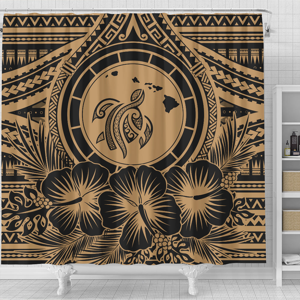 Hawaii Shower Curtain Map Honu Hibiscus Polynesian Gold