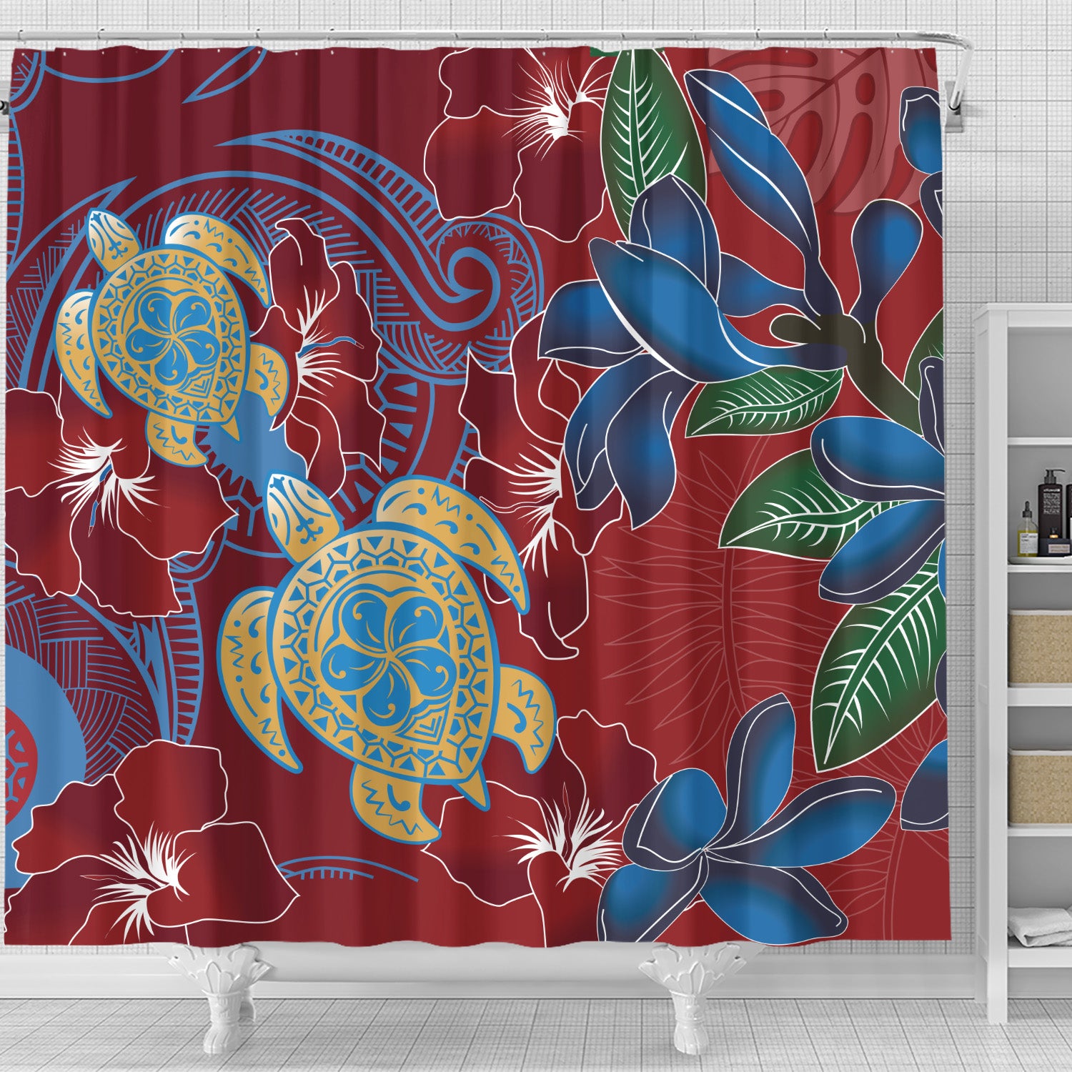 Hawaii Shower Curtain Polynesian Cultures Turtle Couple Tropical Flowers Red Color